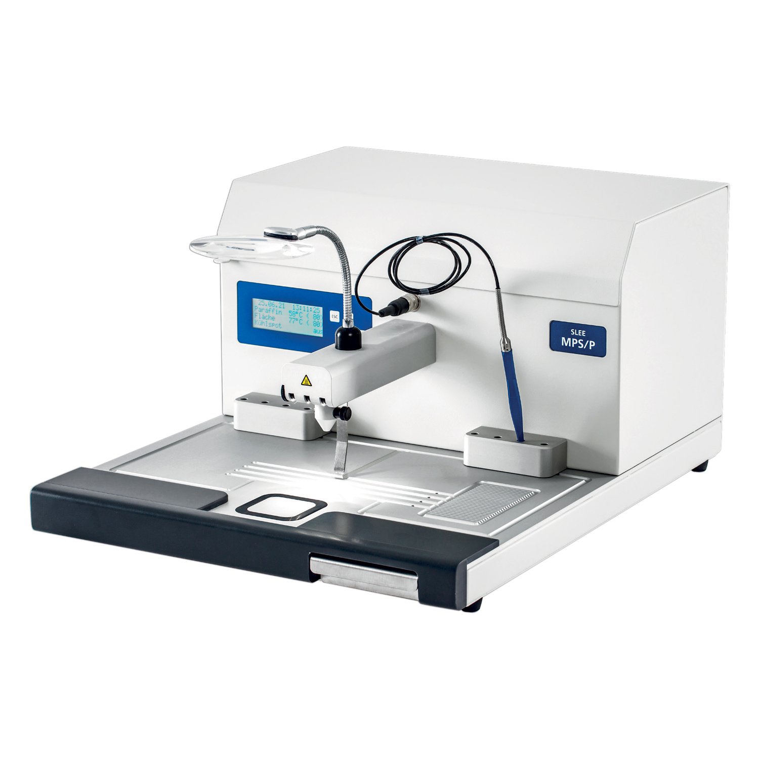 The space saving MPS P I is a complete paraffin dispensing unit including a 3.8 liters paraffin container, a heated working area and a cooling spot. The ergonomically elevated heated working area is illuminated by an adjustable LED light and allows comfortable processing of specimens. All functions of the device are controlled by an intuitive control panel including programmable working hours. Two heated trays provide a pre-warming capacity of 120 cassettes and 250 embedding molds.